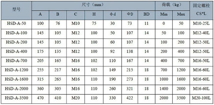4、应在无腐蚀介质(酸、碱)等环境中使用,温度为-10°C—50°C。特殊情况可按用户要求采用特殊材料及设计保护装置。HSD型气垫减震器是由气室、橡胶弹性隔膜、支撑板三部分组成的弹性元件。空气